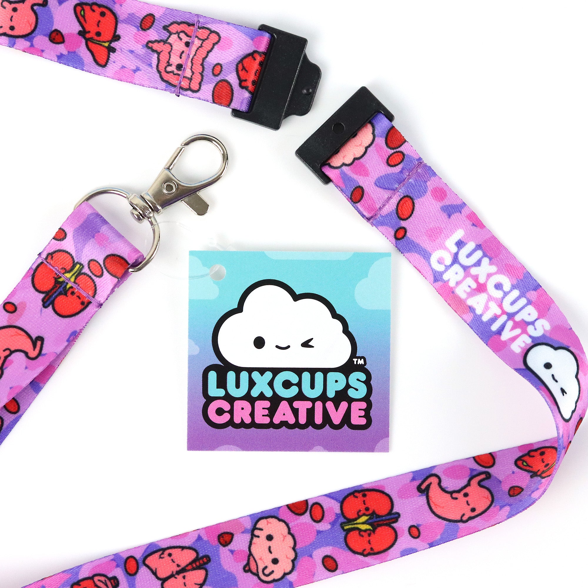 This cute lanyard has a sturdy thumb clasp to hold keys, badges and more! Features a safety breakaway clasp making these great for school, work and conferences.